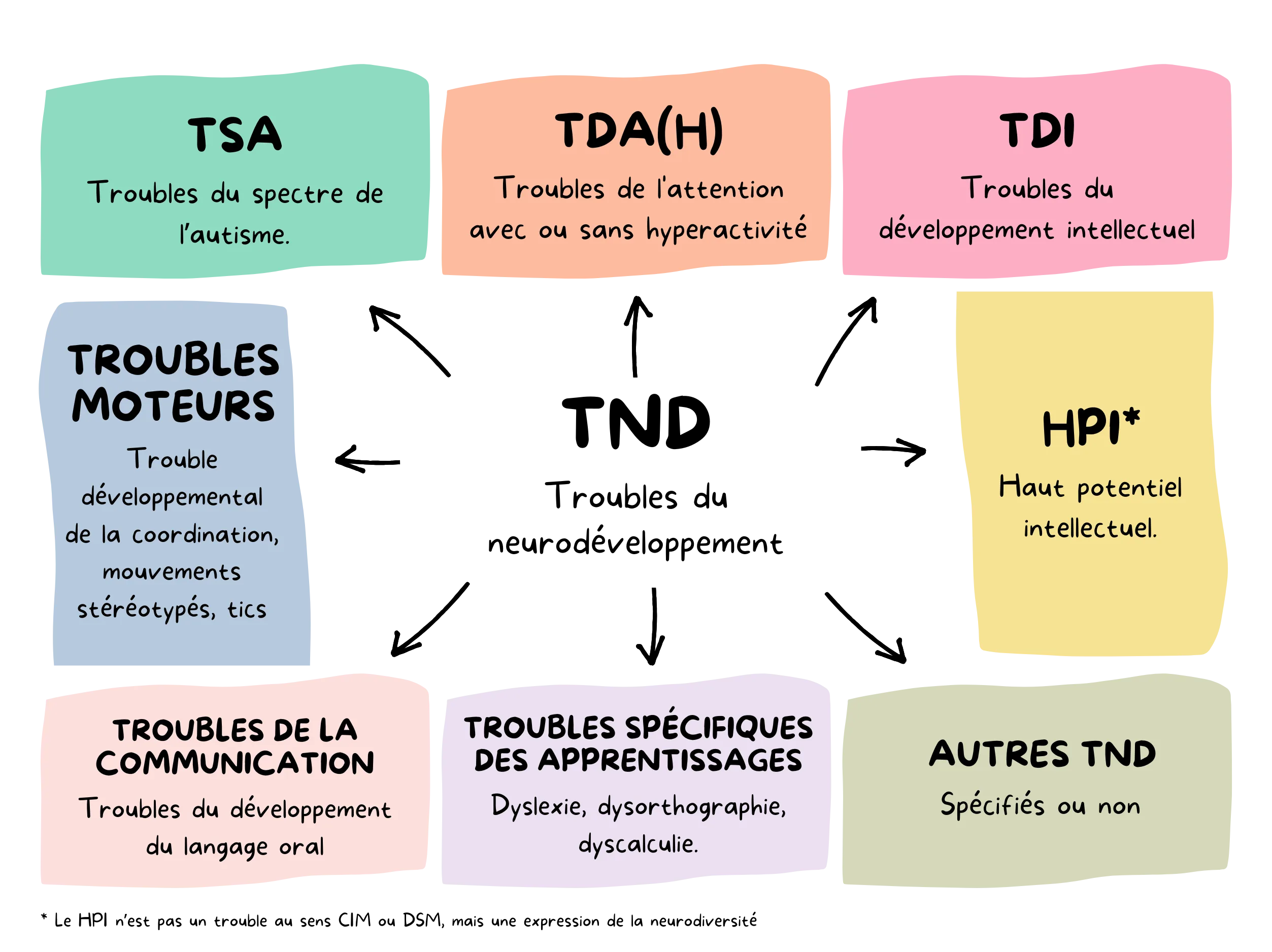 Les troubles du neurodéveloppement (TND) englobent les divers modes de fonctionnement qui résultent d’un développement cérébral atypique durant l’enfance. Les TND comprennent : les troubles du spectre de l’autisme (TSA), les troubles de l’attention avec ou sans hyperactivité (TDA et TDAH), tous les troubles dys (dyslexie, dysorthographie, dyscalculie, dysphasie, dyspraxie, dysproprioception), les déficiences intellectuelles, le syndrome de Gilles de la Tourette, etc. Bien que ce ne soit pas un trouble, le haut potentiel intellectuel (HPI) peut y être associé, le cerveau des HPI ayant, lui-aussi, un câblage particulier.